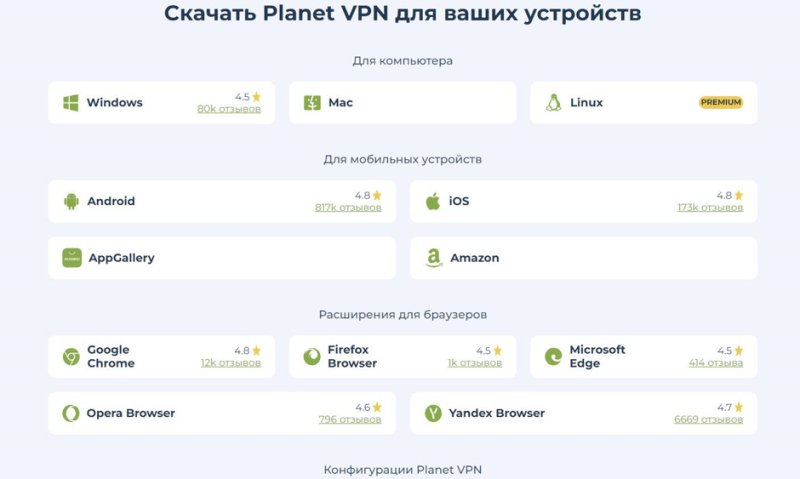 - Основной раздел — устройства. Здесь можно скачать и настроить (или отключить) приложения Planet VPN для десктопа, мобильных устройств или браузеров;